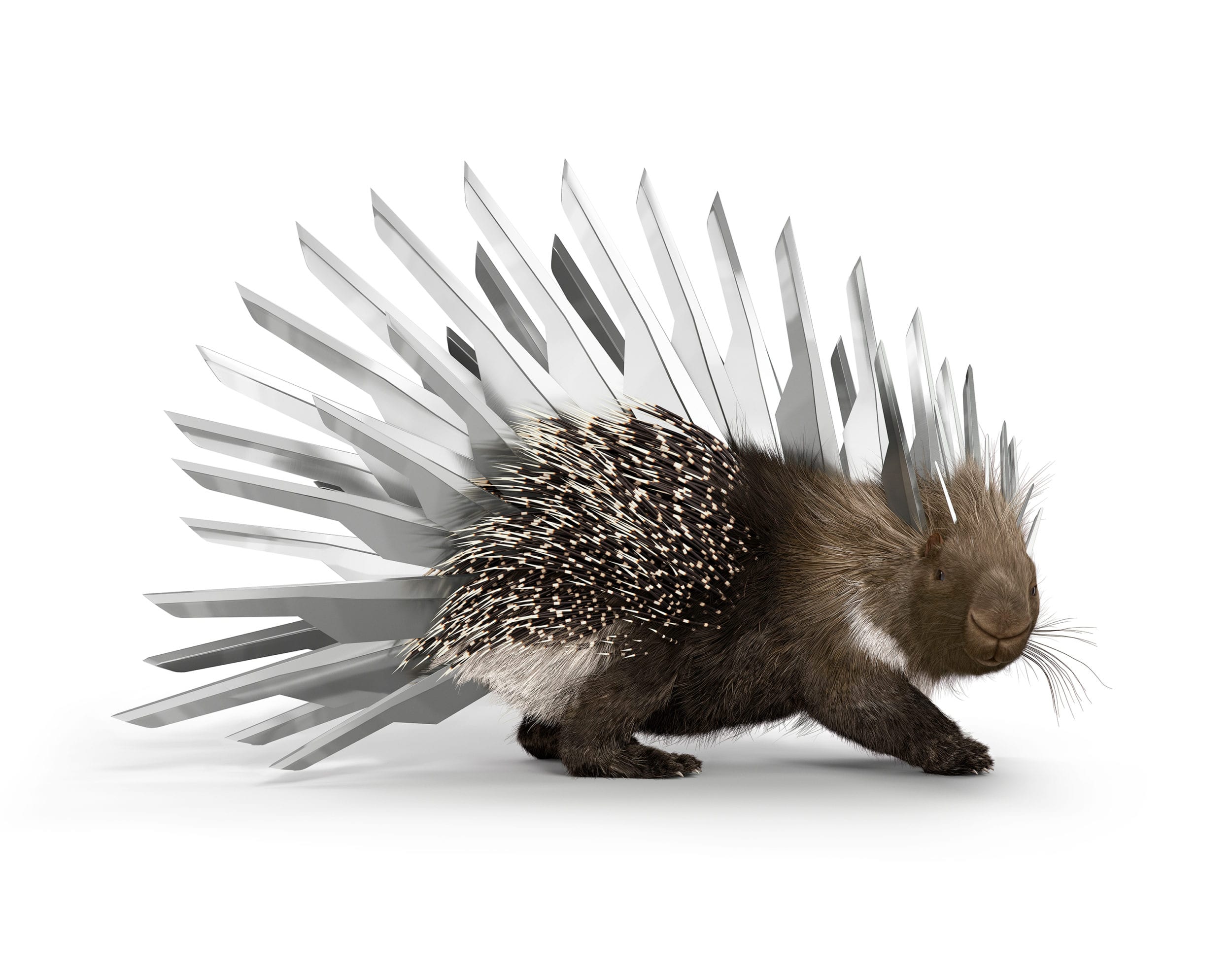 Midway through production we were asked to make it move for a quick reveal animation. So work was undone, redone and we rigged him up. The tricky part was avoiding collisions in the quills and the blades. Lastly the animation solve had to end pixel perfectly to the approved pose and finished hi res art. So this was one job where we worked backward to go forwards.